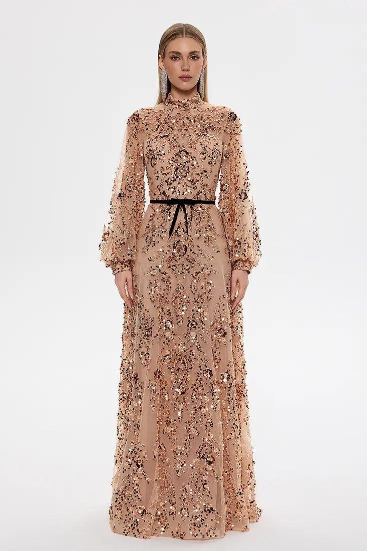 A glamorous mini dress that radiates modern sparkle and sophistication. Crafted from rose-gold sequin fabric...