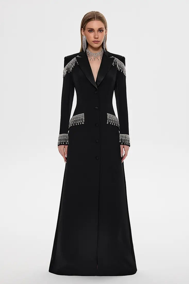 An elegant full-length gown featuring a fitted silhouette and long sleeves, crafted from sheer black...