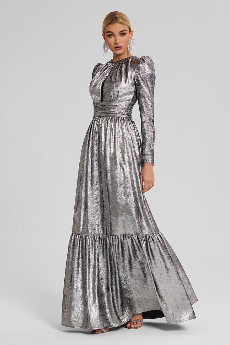 Crafted from shimmering metallic georgette, this full-length gown features dramatic puffed sleeves, a keyhole-style chest...