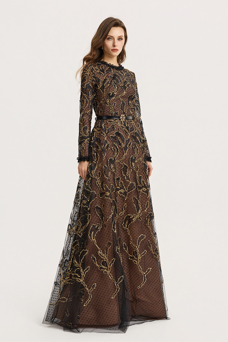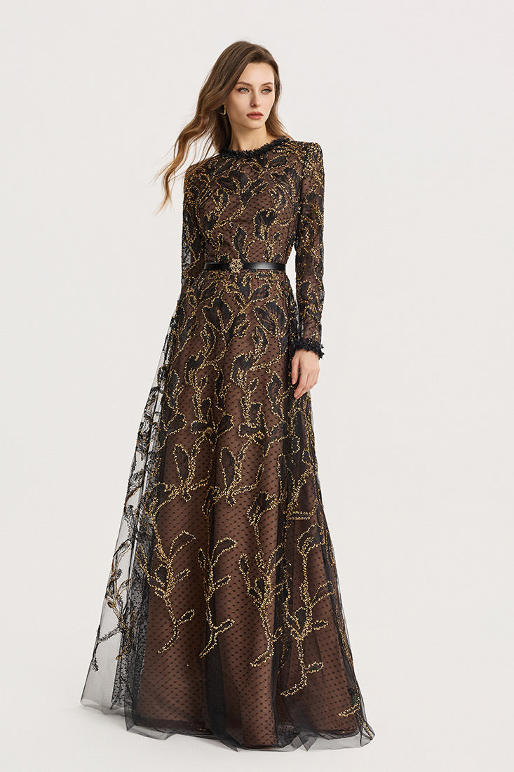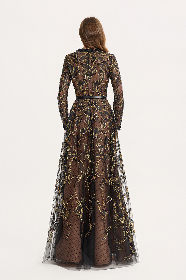 An elegant full-length gown featuring a fitted silhouette and long sleeves, crafted from sheer black tulle richly adorned with golden embroidery . The delicate transparency at the neckline and sleeves adds a touch of sophistication, while the soft flare of the skirt creates graceful movement with every step. Ideal for evening occasions, red carpet events, or festive celebrations.