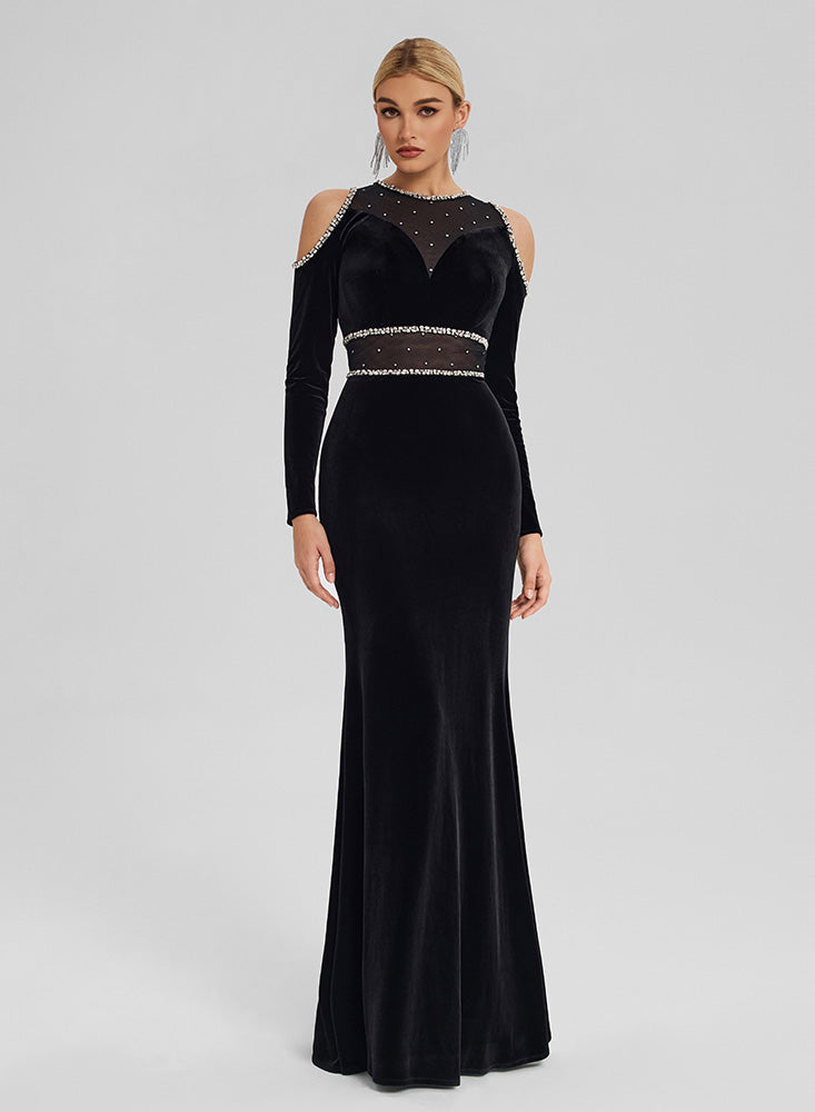 This striking velvet maxi dress features sheer polka-dot mesh panels and bold shoulder cutouts for a contemporary twist on timeless elegance. Crystal bead tape adorns the neckline, shoulders, and sleeve cuffs, catching the light with every move. The figure-hugging silhouette flares gently at the hem, making it perfect for galas, formal evenings, or red carpet occasions.